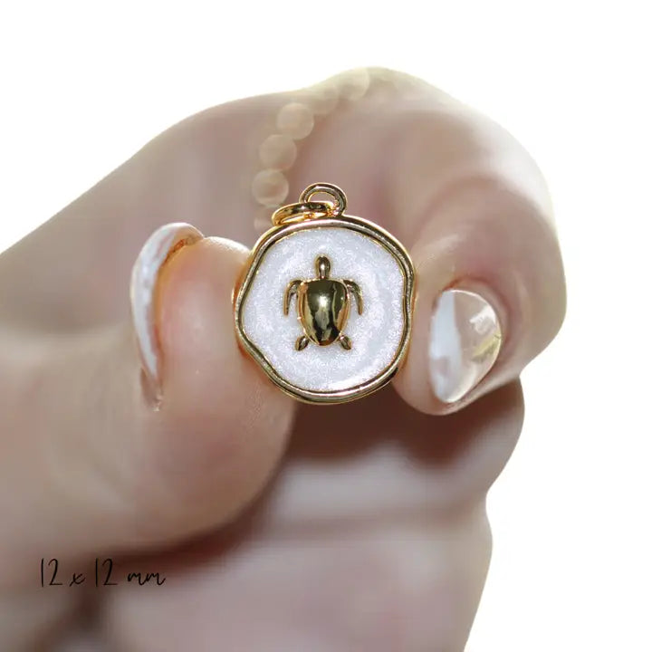 Celebrate the beauty of marine life with the "Golden Sea Turtle ~ White Coin Charm." This charming piece, measuring 12x12mm, features a delicately crafted gold-plated sea turtle resting on a shimmering mother-of-pearl backdrop. Symbolizing longevity and resilience, this charm brings a serene, coastal-inspired touch to any jewelry collection. 14k Gold-Plated Brass – Tarnish-resistant, durable, and designed for lasting brilliance. Mother-of-Pearl Accent – Adds a natural shimmer and elegant detail to the design. Symbolic Design – Represents resilience, longevity, and the beauty of marine life. Coastal Inspiration – Brings a serene and nautical vibe to any jewelry piece. 12mm x 12mm – A petite size perfect for versatile jewelry styling.