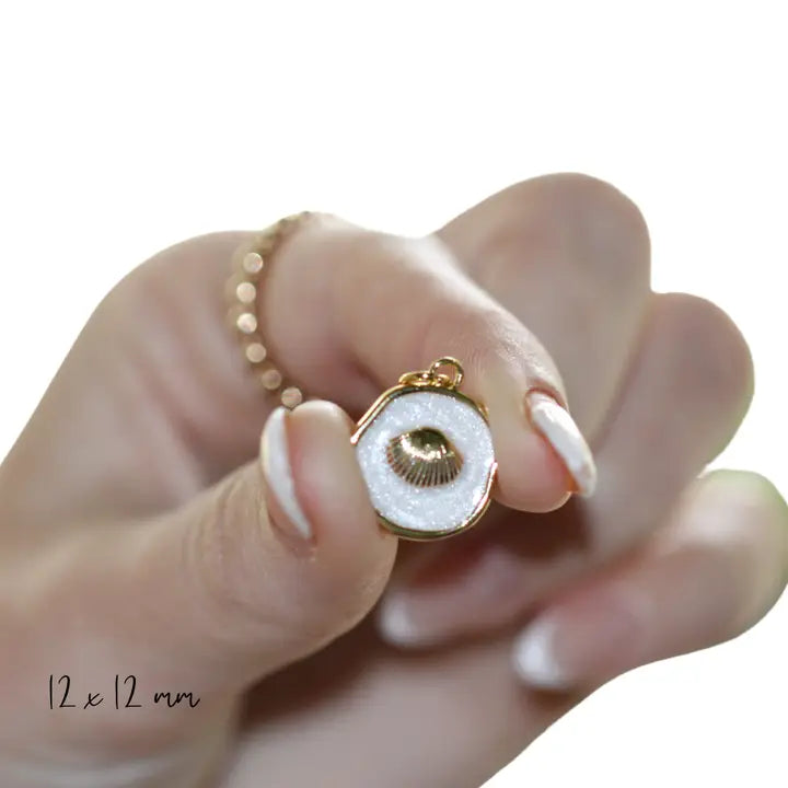 Capture the essence of the ocean with the "Golden Seashell ~ White Mosaic Coin Charm." Measuring 12x12mm, this gold-plated charm features a delicate seashell design resting on a luminous mother-of-pearl backdrop. A symbol of tranquility and the seaside, this charm is perfect for necklaces, bracelets, or earrings, adding a serene and coastal-inspired elegance to your jewelry collection. Material: 14k Gold Plated Over Brass with Mother-of-Pearl Accent